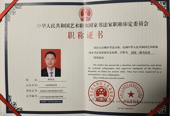 林钦法,1959年生于浙江温州,中共党员,温州市瓯海区人大退休,国家一级书法家。现为中国书法家协会名誉主席、中国书画家协会副主席等职,兼任中国书画交易中心委员会主席、中央电视台签约艺术家、中央新影中学生频道专家评委、翰林院客座教授。同时担任中国传统文化促进会、中国楹联学会、中国东方文化研究会美育委员会、中国文化信息协会产业专业委员会等多个文化组织成员或艺术顾问。2002年荣获中国科协学会“全国优秀学术成果一等奖”;2023年被评为中国书画家协会“中国百强书画家”;2024年车“第十届中华传统文化创新发展论坛”上获授“新时代书画艺术功勋人物”称号。2025年参加于“梵高国际艺术大赛”获特等奖,参加文旅部人才中心"华美行"专业成果展获得《华美金星》荣誉,受邀参加澳大利亚《自然之声—世界美术与人文艺术大展》与2025年日本大阪世博会。