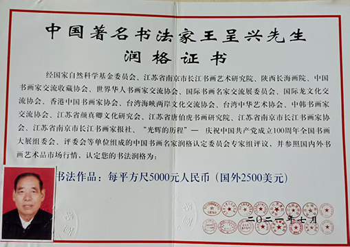 王呈兴,1941年6月生,江苏扬州人,中共党员。镇江市高等专科学校副教授,现已退休。曾任江苏省劳动经济学校教务科副科长,校工会副主席,教师党支部书记等职。江苏省硬笔书法家协会、安徽黄河书画艺术家协会、北京华夏国艺书画院会员。高级书画师。书法作品入《世界艺术经典名家名作》,并获得荣誉主编和封面人物荣誉称号。书法作品入选并参加中欧国际艺术展。诗词作品入《四库范例全书》并获得范例奖和特邀主编。荣获世界非物质文化终身成就奖。荣获“中国文学艺术界学术奖”,授予文化艺术学术博士学位,又授予“瑞典皇家美术学院荣誉博士学位”。