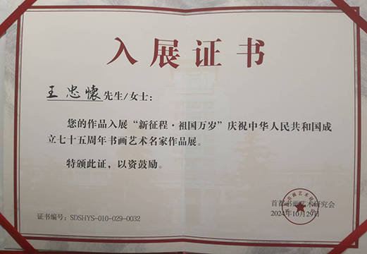 王忠怀,中国当代书画名家,江苏著名书法家,毕业于无锡书法艺专,河南书法函授院,中国书画函授大学。作品入选《中国民法典》、《中国书法家全集》、《中国国际文学艺术博览》等书,入选各级展览达五十余次,获金奖等各种奖项达二十余次,并被中国民协、云南爨宝子碑林、广东德山碑廊等多家收藏。现任南京南都书画院常务副院长,翰墨江南书画院副院长,金陵书画院特聘书法家,国家一级美术师,国礼书法家。
