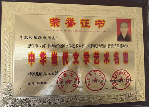 杨海成,男,回族,甘肃省平凉市崆峒区人。生于1949年5月,字:志毅,号:龙泉主人,经名:优素福。书法作品在国内外获各项大奖十余项,获得称号十余项并被推荐发行邮政明信片多套,曾被主办单位特邀去多国笔会巡展,作品在丹麦、挪威、法国、日本、韩国展出,现任中国书画家协会会员,中国书画名家协会理事,中国书法学会理事,世界华人书画文学学会名誉主席,北京崇阳书画院院士,甘肃省穆斯林书画摄影协会会员,平凉市书法家协会会员,长城魂当代诗书画家协会特邀名誉主席,中国文化艺术研究会学部研究员。并获国际艺术友人奖,日本东京都木更津市展山奖项,艺术交流使者,中法友好艺术家,华人艺术家,韩国国际艺术名家,文化使者,作品被编入世界人类非物质文化遗产传承人目录,神州艺术专家名录,作品被社会各界书画爱好者收藏。